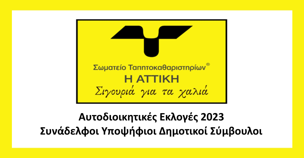 Το Σωματείο Ταπητοκαθαριστών Η ΑΤΤΙΚΗ στηρίζει τους συνάδελφους Ταπητοκαθαριστές, οι οποίοι θα διεκδικήσουν την ψήφο των πολιτών, στις αυτοδιοικητικές εκλογές στις 08/10/2023, προβάλλοντας την υποψηφιότητα τους, στην ιστοσελίδα του.